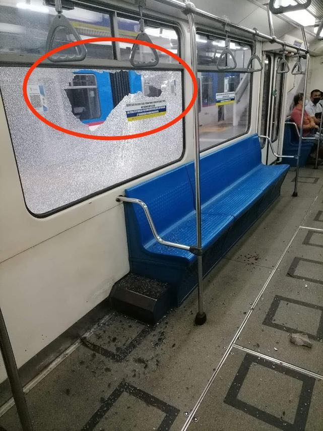 投石により窓ガラスが割れたMRT車両=21日、トゥガデ運輸相のフェイスブックより