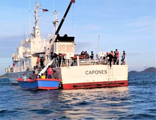 パラワン州アラセリ町沖で住民に支援物資を供与する「BRPカポネス」=1月6日、比沿岸警備隊公式フェイスブックより