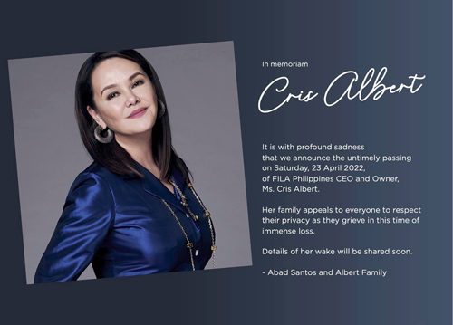 フィラ・フィリピンがフェイスブックに掲載したクリス・アルバートさん死去の知らせ