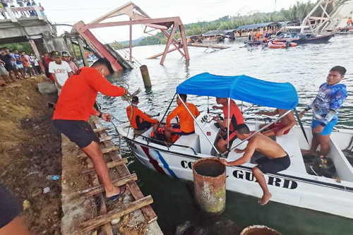 崩落したボホール島のクラリン橋と救助活動にあたる沿岸警備隊員ら=比沿岸警備隊フェイスブックより