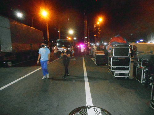 設営が進むロブレド候補の選挙集会会場。深夜にもかかわらず多くの支持者が集まり始めていた=7日午前0時ごろ、アヤラ、マカティ両通り交差点で写す