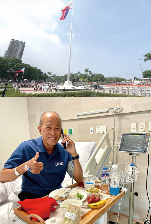 (上)リサール公園で開かれた独立宣言から124年目を記念する式典=12日、首都圏マニラ市で大統領府報道班の映像から/(下)病室から元気そうな様子を知らせるロレンサーナ国防相=12日(同相のフェイスブックページから)