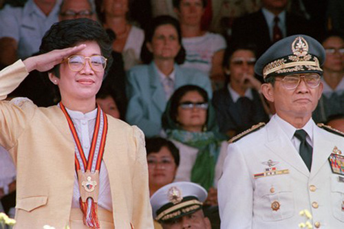 コリー・アキノ大統領=当時=(左)とラモス氏=1986年3月、北部バギオ(AFP時事)