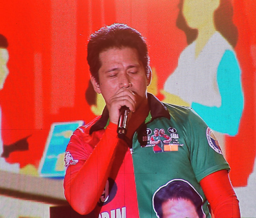 ユニチームの最終選挙集会で演説するパディリヤ上院議員=5月7日、首都圏パラニャーケ市で竹下友章撮影