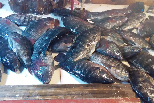 バタガス州ナスグブ町の市場で販売されているティラピア(イズミダイ)=3月6日、竹下友章撮影