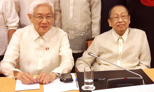 ドゥテルテ政権との和平交渉の席に着く比共産党創立者ホセ・マリア・シソン氏(右)ら=2017年4月、オランダで(AFP=時事)