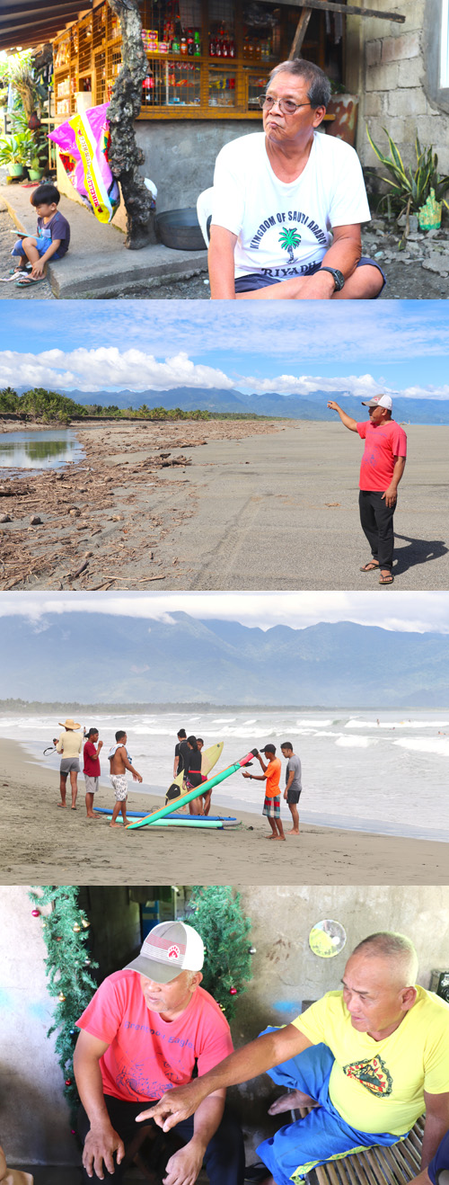 写真上から①「地獄の黙示録」撮影でセットの村の建設やエキストラ出演した経験を持つウィルフレド・ロケさん②映画撮影に使われた場所やヘリコプターが駐機していた場所を教えてくれたバランガイ議員のロバート・ゴンサレスさん③バレール町のサーフィン所として有名なサバンビーチで、サーフィンをしようとする観光客ら。人影はまばら④自身がエキストラ出演した「地獄の黙示録」を初めて目にし、興奮気味のルーベン・エルミニヒルドさん(右)=2022年11月28日、アウロラ州バレール町で岡田薫撮影
