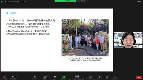 講演会でメモラーレマニラ1945財団によって今年2月18日に行われた慰霊祭について紹介する永井均・広島市立大学教授=沖本直子フェザペップ代表提供
