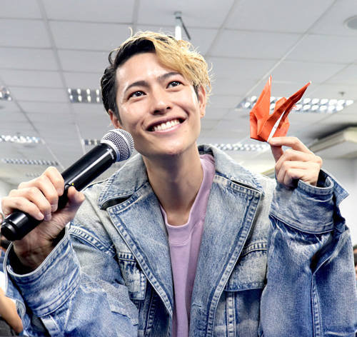 自作の折鶴を手にするFumiyaさん=9日、首都圏マカティ市のマカティサイエンス高校で岡田薫撮影