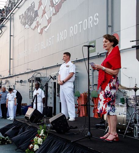 強襲揚陸艦アメリカ艦上で開催されたレセプション=21日夜、同艦公式フェイスブックより