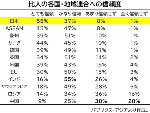 比の民間調査会社パブリクス・アジアは17日、上半期に実施した外国・地域連合への信頼度に関する世論調査の結果を発表した。それによると、日本を「とても信...