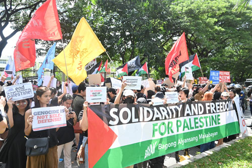 首都圏タギッグ市の在比イスラエル大使館前で10月31日、ガザ地区を実効支配するイスラム組織ハマスとイスラエルの戦闘の即時停戦を求め、イスラエルによる...