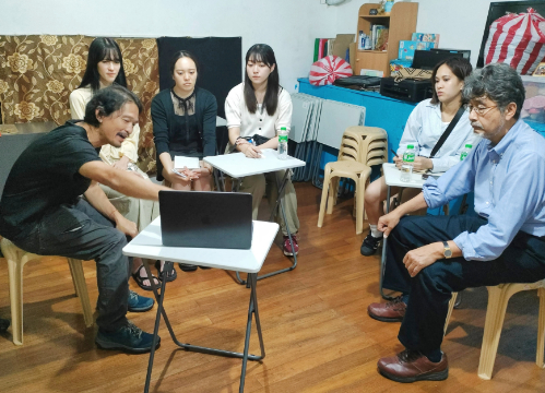ラフィー・レルマさんの話に耳を傾ける明治学院大学のグループ=1日、首都圏マニラ市で岡田薫撮影