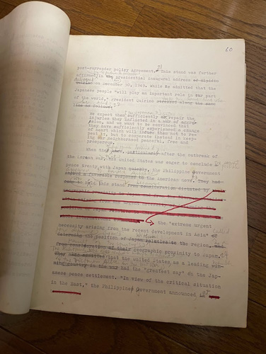 サニエル博士が添削した「比日賠償交渉」に関する大野氏の修士論文の原稿=大野拓司氏提供