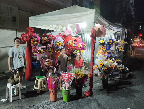 カラオケ街に急きょお目見えした生花店=13日夜、首都圏マカティ市で岡田薫撮影