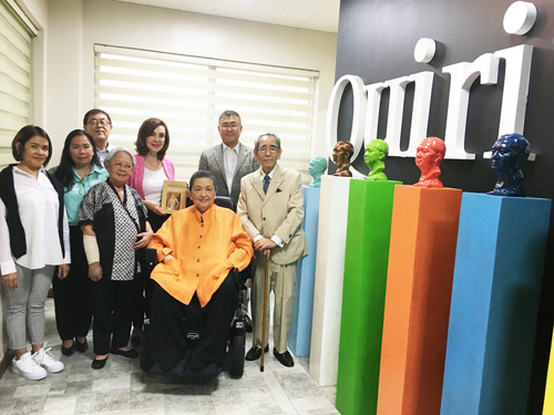 キリノ財団事務所入口での写真、左からマリレット事務局長、エラ比日連合財団理事、高木英治工事担当責任者、アンジェラ・キリノ現理事長、コリー・キリノ女史、ルビー・キリノ前理事長(車椅子の方)、田畑政己・代表補佐役、右端は私(浅沼武司)です。