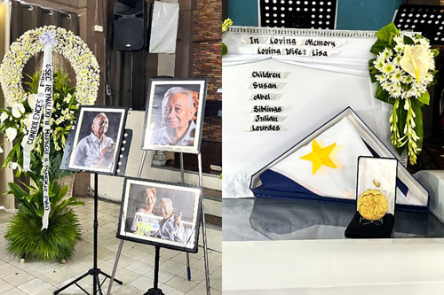 (左)祭壇に置かれたブエンコンセホさんの写真(右)と、棺の上に飾られた米国議会からの勲章=18日、首都圏マニラ市のフェローシップ・センター・バプティスト教会で深田莉映撮影