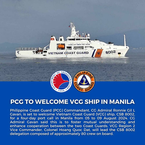 フィリピン沿岸警備隊(PCG)は5日午前、ベトナム沿岸警備隊(ⅤCG)の巡視船CSB8002によるマニラ湾への寄港を歓迎した。同巡視船は9日までマニ...