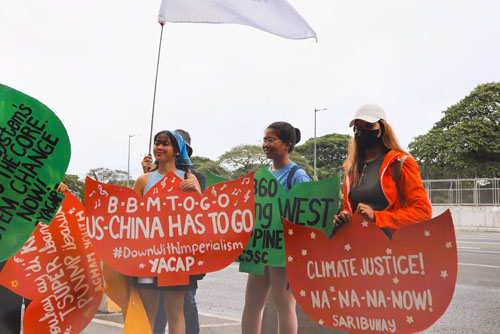 大統領施政方針演説(SONA)と同日に行われた左派のデモで、「反米・反中」を訴える環境活動家ら=24年7月22日、瀬名波栄志撮影
