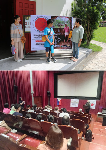 その後に行われた上映会は、雷雨に見舞われたが、残留日本人である宮里千鶴子(ミヤサト・チズコ)さんはじめ日系2世の人たちとその家族、またUPビサヤ校学長クレメント・カンポサノさんやNPO法人LOOB・JAPANの代表理事小林幸恵さんら約50人が駆けつけた。中には入口の映画ポスターの前に立ち期待と不安の気持ちを表している人たちも多くいた。
