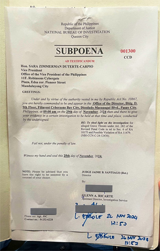 サラ副大統領による大統領暗殺発言を巡り、サラ氏に国家捜査局(NBI)への出頭を求める勾引状が26日正午ごろ副大統領事務所に送達された。勾引状は25日...