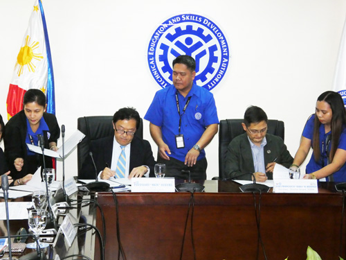 首都圏タギッグ市にある技術教育技能開発庁(TESDA)本部で17日、国際交流基金マニラ日本文化センター(JFM)と同庁が、日本語教育の支援に関する議定書(MOA)の締結式を行った。鈴木勉同センター所長と在フィリピン日本大使館からは鈴木勇紀一等書記官らが参加、TESDAからはホセ・ベニテス長官やフェリザルド・コロンボ副長官らが参加した。