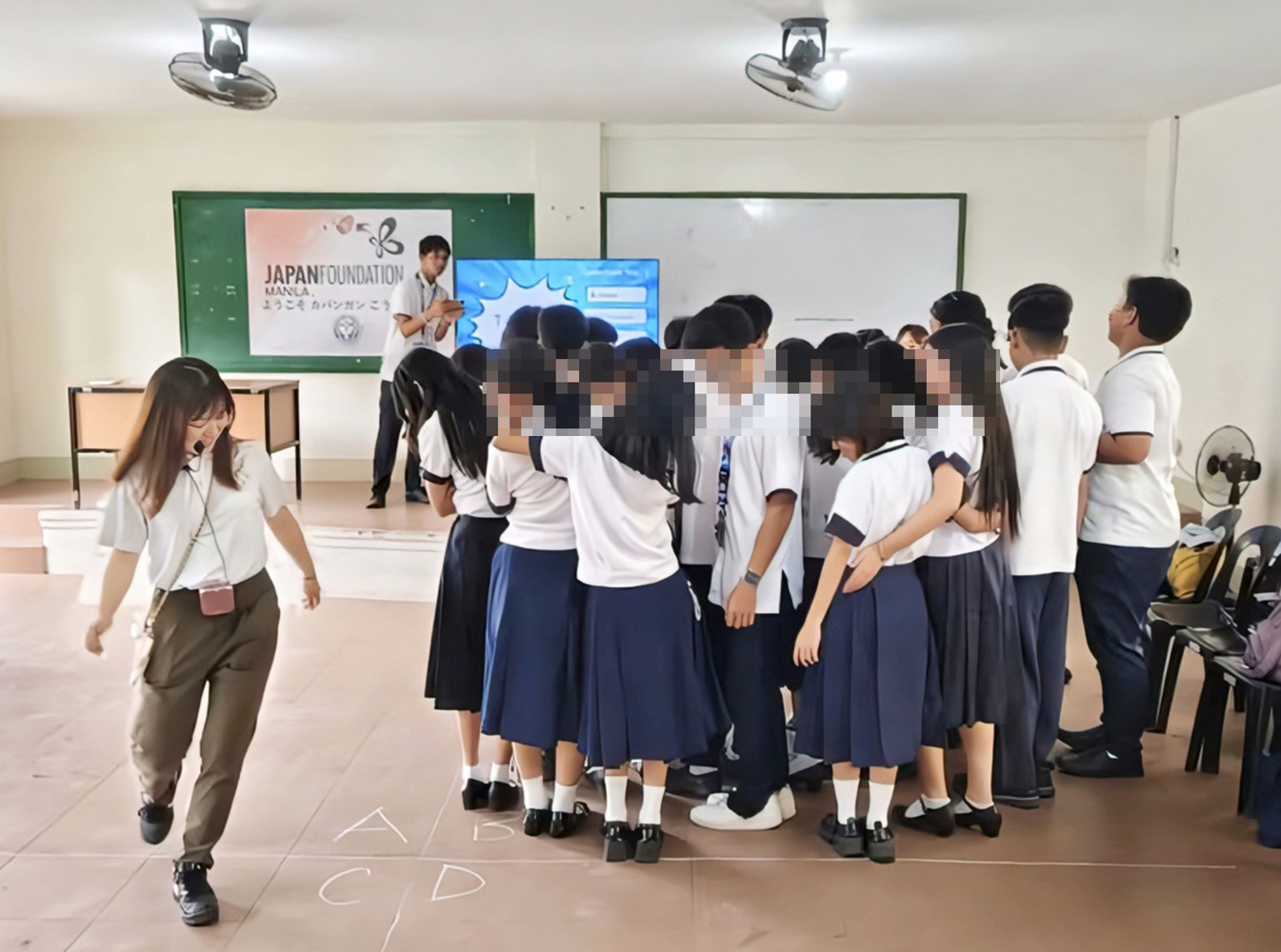 比人教師が主導する「通常授業」形式で、岡本さんは日本語の発音指導やゲームも取り入れた授業進行を手伝うなどした。外国人に英語検定のIELTSを教えるなどし、同校で6年前から英語教師を務めるエルミー・エンジェル先生は、JFМを通じて日本語研修を受け、3年程前から日本語を教える。この日の授業では教室の床に長い線を引き、空間をA~Dに4等分。生徒は単語の意味と一致する空間に移動するクイズゲームで、最終的に残った一人に景品が与えられ、大盛り上がりだった。