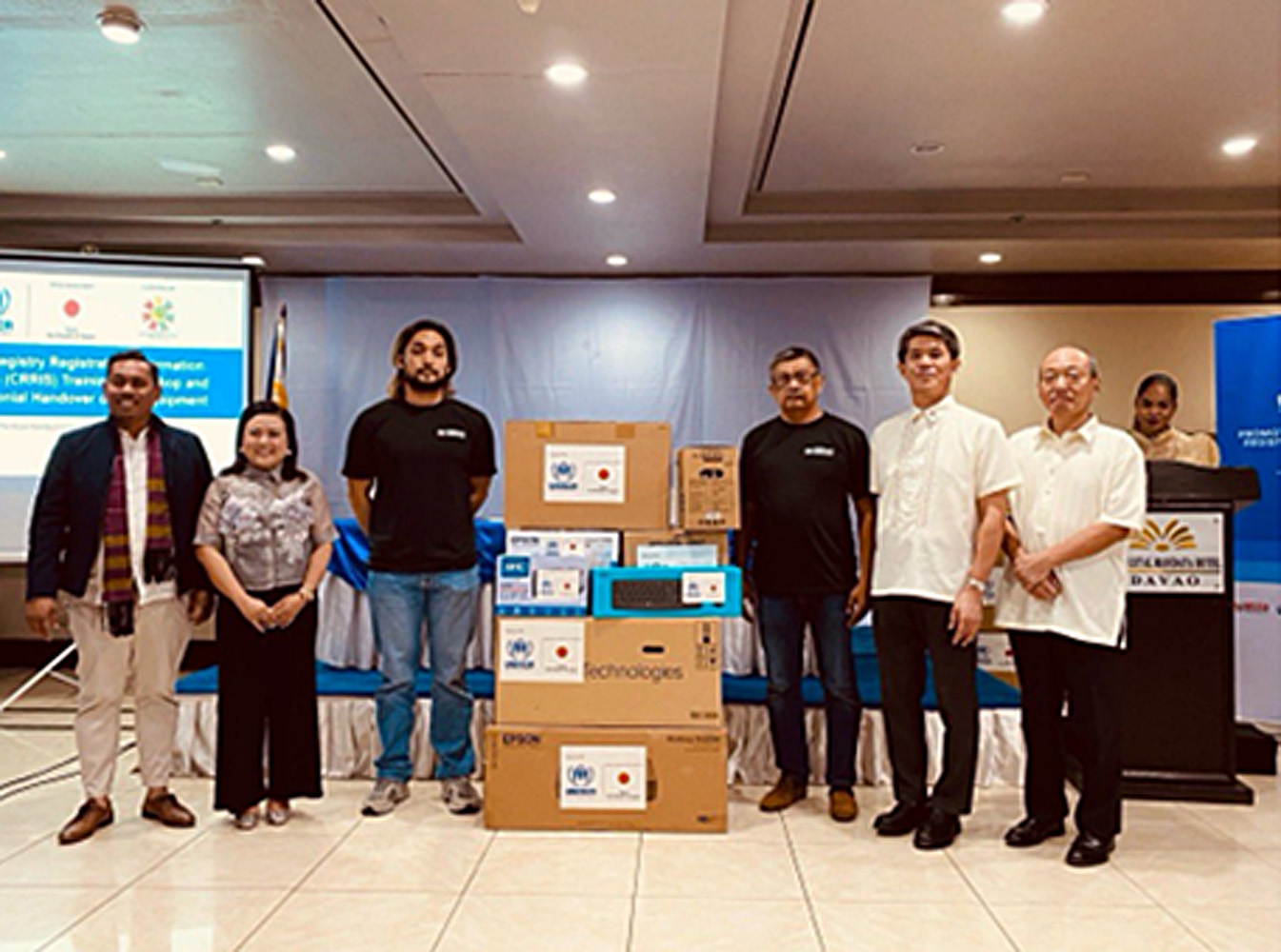出生登録支援機材供与式典に出席した遠藤大使(右から2人目)ら=在比日本国大使館提供