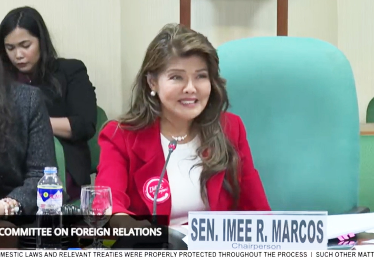 公聴会でアイミー委員長は、当局が国内裁判所の命令なしでドゥテルテ氏の身柄を拘束し、ICCに引き渡した事実を追及。出席したレムリヤ司法相は、「ドゥテルテ氏はICCに引き渡されたのであり、法律の定める(令状の必要な)『送還』ではない。ICCへの引き渡しが唯一の方法だった」と答弁した。また、「法の適正手続(デュー・プロセス)や権利を定める憲法3条に違反しないか」との委員長の質問には「ICCは7年をかけて適正な手続きを進めてきた」と回答した。