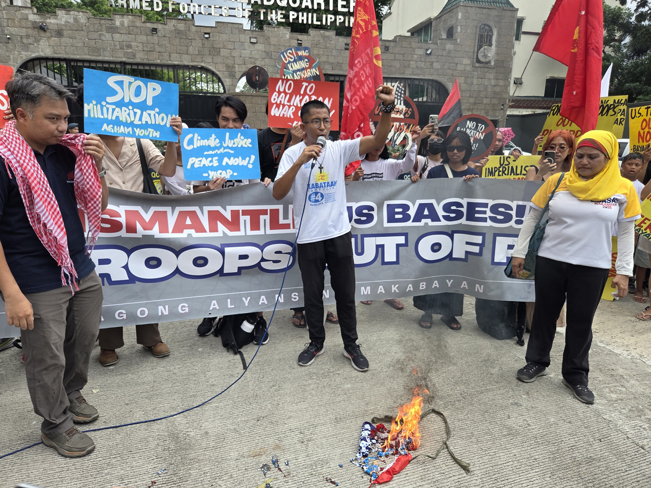 左派系市民連合バヤンと関連団体は21日、比米合同軍事演習「バリカタン」の開始式が開催される首都圏ケソン市の国軍司令本部(キャンプ・アギナルド)の前で抗...