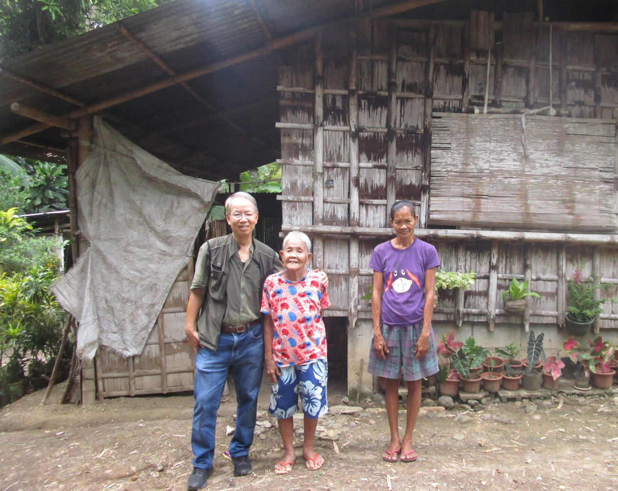 2024年10月19日、自宅前に立つ宮里千鶴子さん(中央)と筆者。右は三女のレオノラさん