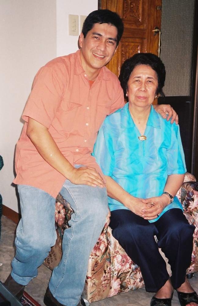 面談に応じてくれたテシバ・トヨコと七男のアーウィン・トゥルフォ=2002年12月8日、マニラ首都圏ケソン市の自宅で