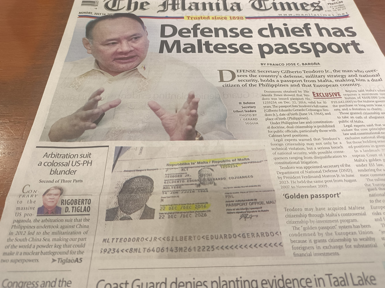 英字紙マニラタイムズの1面トップに掲載されたテオドロ国防相のマルタ旅券のコピー