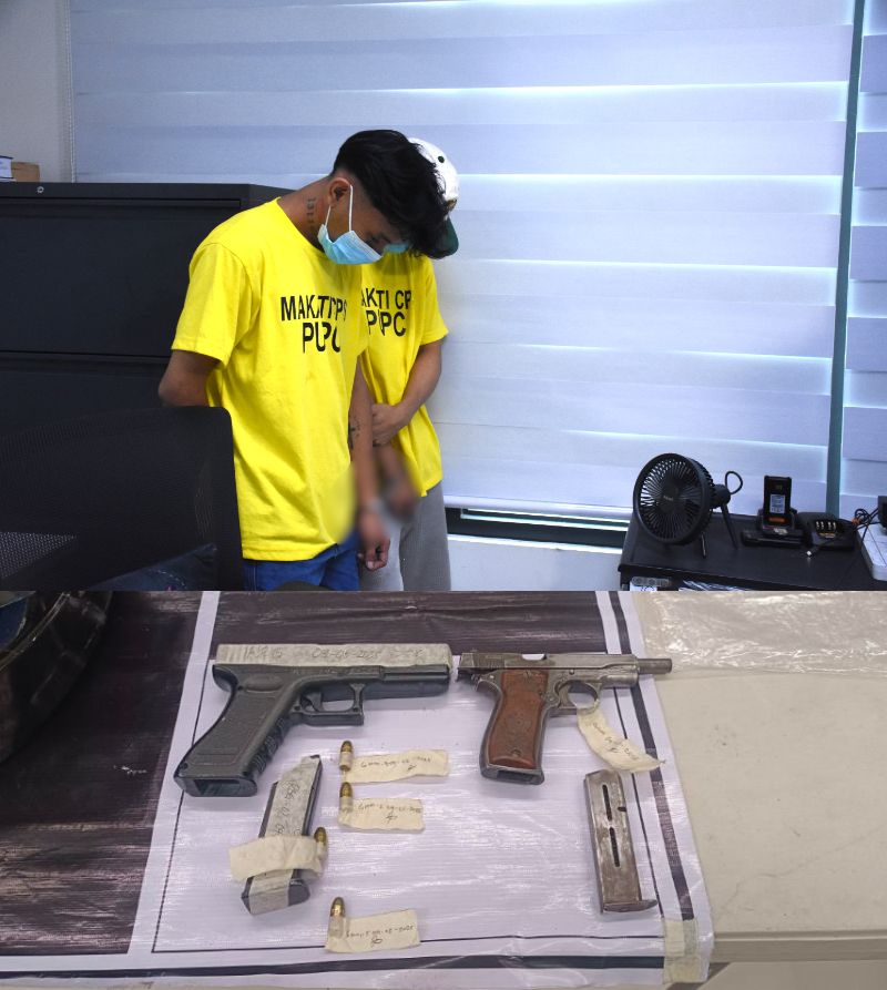 (上)マカティ署に勾留されているアンヘロ容疑者(手前)=5日、首都圏マカティ市マカティ警察署で竹下友章撮影/(下)押収された拳銃=5日、首都圏マカティ市マカティ警察署で竹下友章撮影