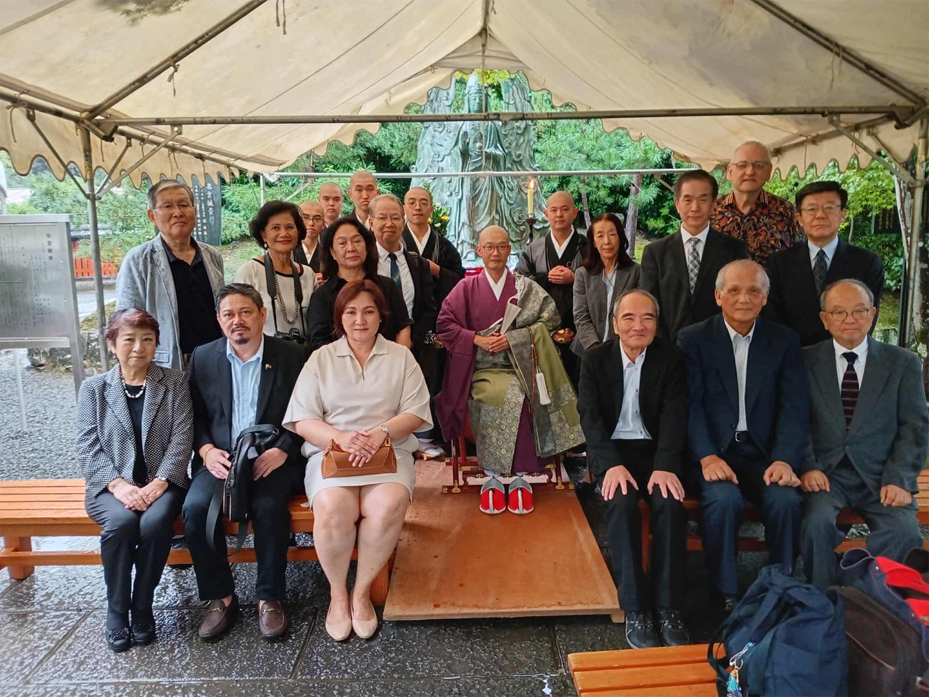 天龍寺の飛雲観音像の前で法要を行い記念撮影に収まる参列者ら=大野俊氏提供写真