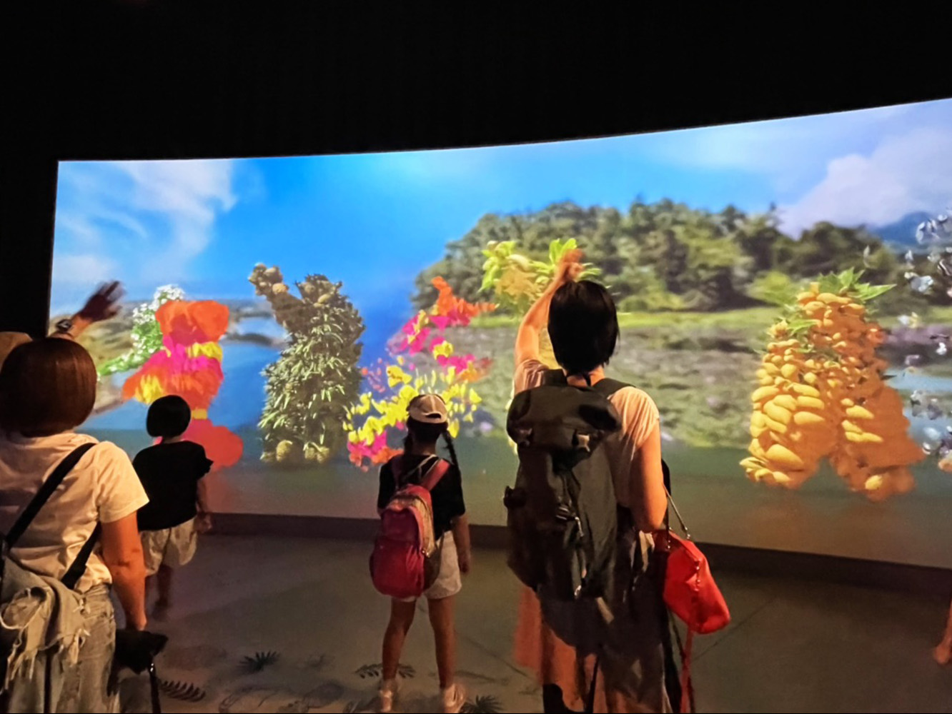 スクリーンに向かって踊る来場者たち=8日、万博会場内で宇井日菜撮影