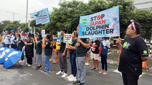 日本のイルカ漁に抗議 動物愛護団体らが日本大使館前で