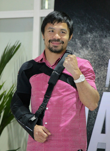 右肩にギプスを付け、ガッツポーズを見せるパッキャオ=首都圏パサイ市のマニラ空港第2ターミナルで13日午前4時15分ごろ写す