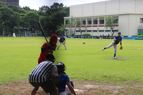 首都圏タギッグ市のマニラ日本人学校(MJS)のグラウンドで第26回ソフトボール大会決勝トーナメント第1試合トゥーホイラーズ対ムラタ戦が開戦=16日午前9時ごろ、沼田康平撮影