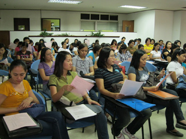 渡日前説明会に出席した看護師候補者70人=27日午後2時ごろ、首都圏マンダルーヨン市の労働雇用省海外雇用局で写す
