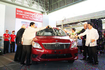 生産50万台記念式典で「イノーバ」にシャンパンをかける卜部敏直駐比日本大使ら=8日午前10時半ごろ、トヨタ・モーター・フィリピンのサンタロサ工場で写す