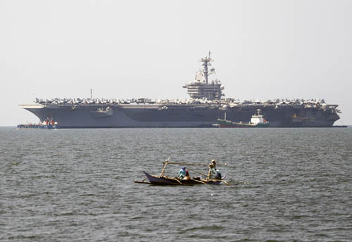 マニラ港に寄港中の米原子力空母カール・ビンソン=17日、マニラ湾で撮影(EPA=時事)