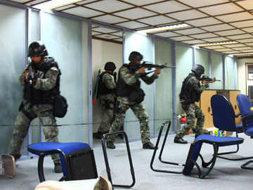 訓練で人質がいる部屋に突入する特別部隊=13日午後4時ごろ、ルソン地方バタンガス州バタンガス市で写す