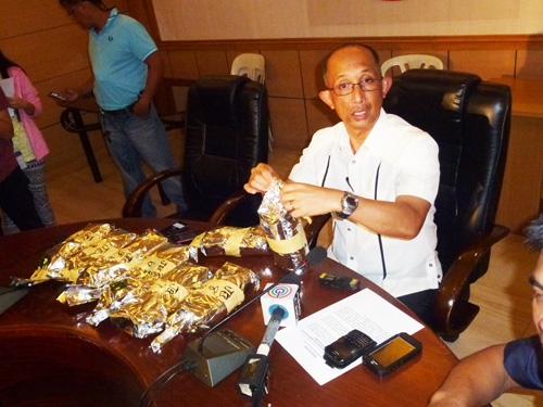 アルミホイルに包まれた覚せい剤を公開する捜査員=21日午後3時半ごろ、首都圏ケソン市の国家警察本部で写す