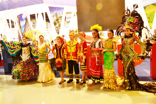 各地の民族衣装で来場者を出迎える「フィリピン・トラベルマート」のスタッフら=5日午前11時ごろ首都圏パサイ市の会場で写す