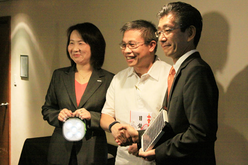 ソーラーランタンを寄贈する乾室長(左)とパナソニックフィリピンズの豊田副社長=17日午前11時ごろ、首都圏マカティ市で写す