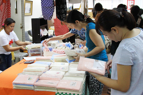 NGOバザーで刺しゅう入りのタオルを手に取る来場者=29日午前11時ごろ、首都圏マカティ市で鈴木貫太郎写す