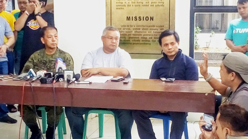 記者会見する南ラナオ州知事(中央)とマラウィ市長(右)=27日午前11時半ごろ、ミンダナオ地方南ラナオ州マラウィ市でクリサント・バリエタ撮影