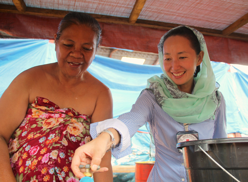 避難民の女性に赤十字が設置した手洗い場の状態について聞く松沢さん=11日午後、ミンダナオ地方南ラナオ州サギアラン町で冨田すみれ子撮影