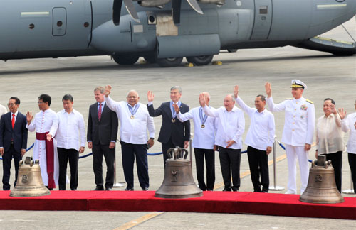 三つの鐘の後ろに並ぶソン・キム駐比米大使(中央の鐘の後ろ)ら比米両国の関係者=11日午前、首都圏パサイ市のビリヤモール空軍基地で福島夏歩撮影